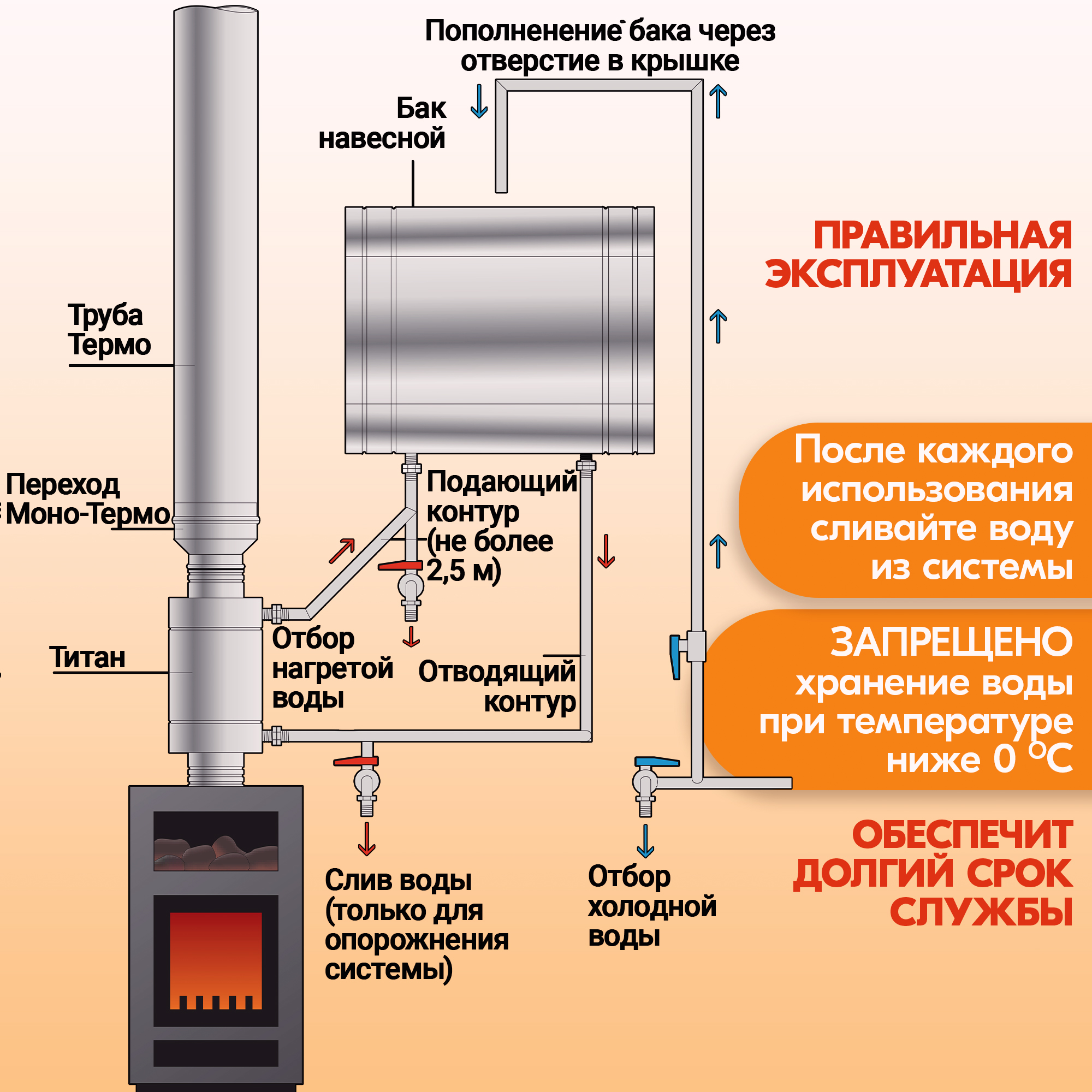 Схема навесной бак и титан идеальна для создания сухих бань: в парилке находится только герметичный титан, не создающий водяных паров.