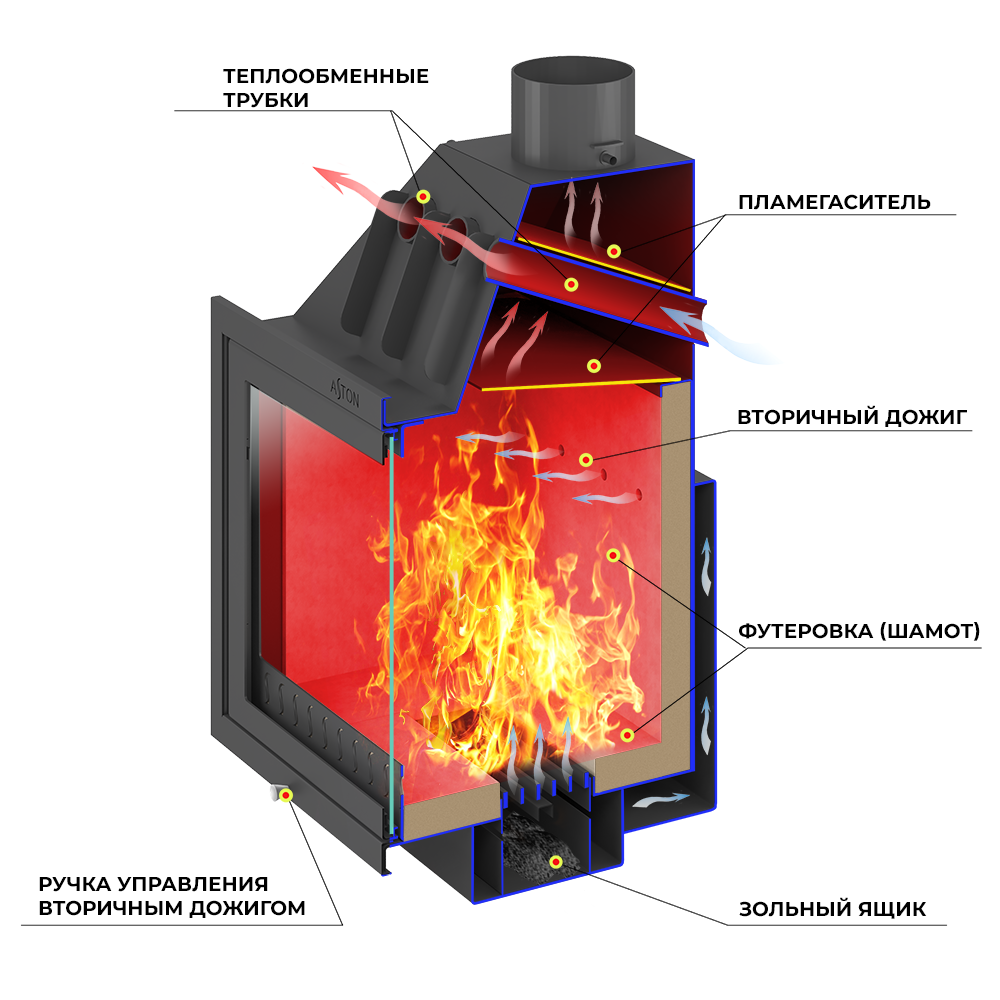 Трубы, размещённые над топочной камерой в области дымосборника, увеличивают скорость движения нагретого воздуха и усиливают конвекционные возможности каминной топки АСТОН 700. Пламя и дымовые газы, догорая, огибают пламегаситель в верхней части топочной камеры. В дымосборнике. над конвекционными трубами, расположен второй пламегаситель, который повторно меняет направление движения газов и таким образом способствует их полному догоранию в топке. За счёт совместной работы двух пламегасителей достигается максимальная тепловая эффективность каминной топки АСТОН 700, в том числе повышается теплоотдача печи путём усиления конвекции.