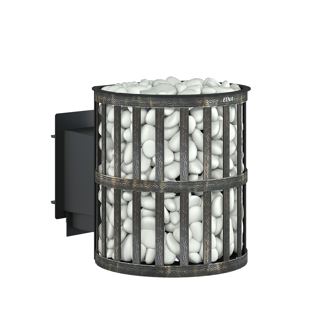 Для устройства наружной открытой каменки печь ЭТНА 18 оснащается сеткой из стальной ленты. Узор на наружной поверхности сетки патинирован термостойкой бронзовой краской. Пространство между печью и сеткой заполняется камнями для бани, которые выполняют роль теплонакопителя, перераспределяют тепло от стенок топки и защищают парящихся от жёсткого инфракрасного излучения. Воду подают на нагретые камни, с которых полученный пар распространяется по всему объёму парной.