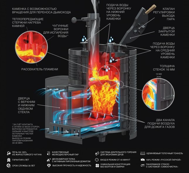 Под каменкой на 3-х упорах установлен рассекатель пламени, он разделяет  пламя на 3 потока и направляет сначала на боковые части корпуса для интенсивного нагрева стенок и конвекционного нагрева воздуха в парной. Для этого на наружных поверхностях расположены конвекционные рёбра. Дальше пламя проходит через выступы к выходу в дымоход, нагревая каменку.