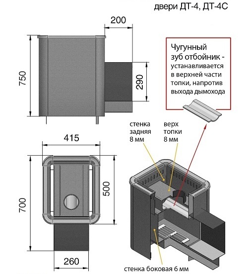 Топка печи выполнена из специальной конструкционной стали толщиной до 12 мм. Сталь благодаря своей устойчивости к высоким температурам не подвергается деформации. Топочная дверца изготовлена из высококачественного чугуна. Длинная колосниковая решётка из массивного литейного чугуна, обеспечивает равномерное горение дров, столь необходимое для банной печи. Выдвижной зольный ящик позволяет удалить накопившуюся золу, не прерывая горения и эффективно регулировать его интенсивность. Все эти характеристики позволяют утверждать, что эту модель можно считать самой скоростной печкой по прогреву парильного помещения.