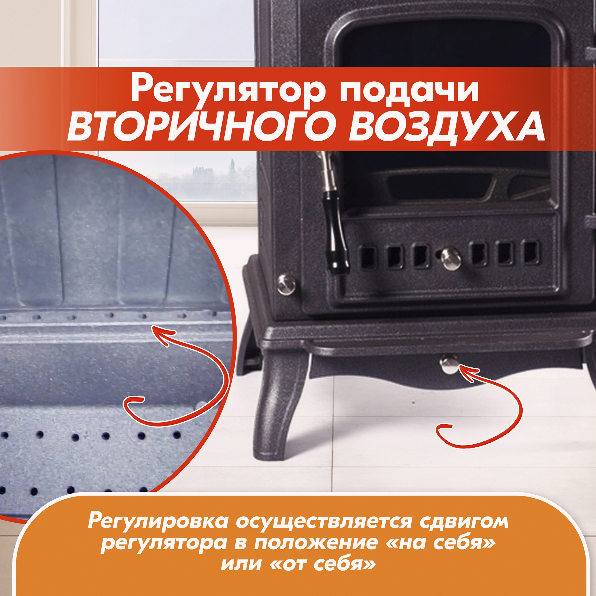 Благодаря конструктивным особенностям чугунной печи-камина достигается высокий уровень теплоотдачи при небольшом расходе дров.