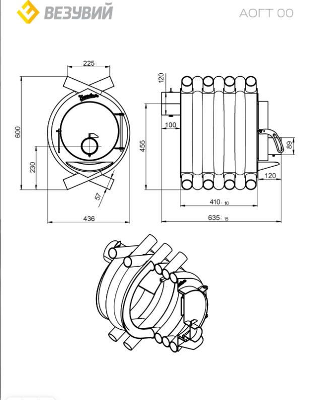 Печь отопительная ВЕЗУВИЙ АОГТ 00 предназначена для обогрева бытовых нежилых и промышленных помещений. Печь рассчитана на обогрев помещений объёмом 100 кубических метров.