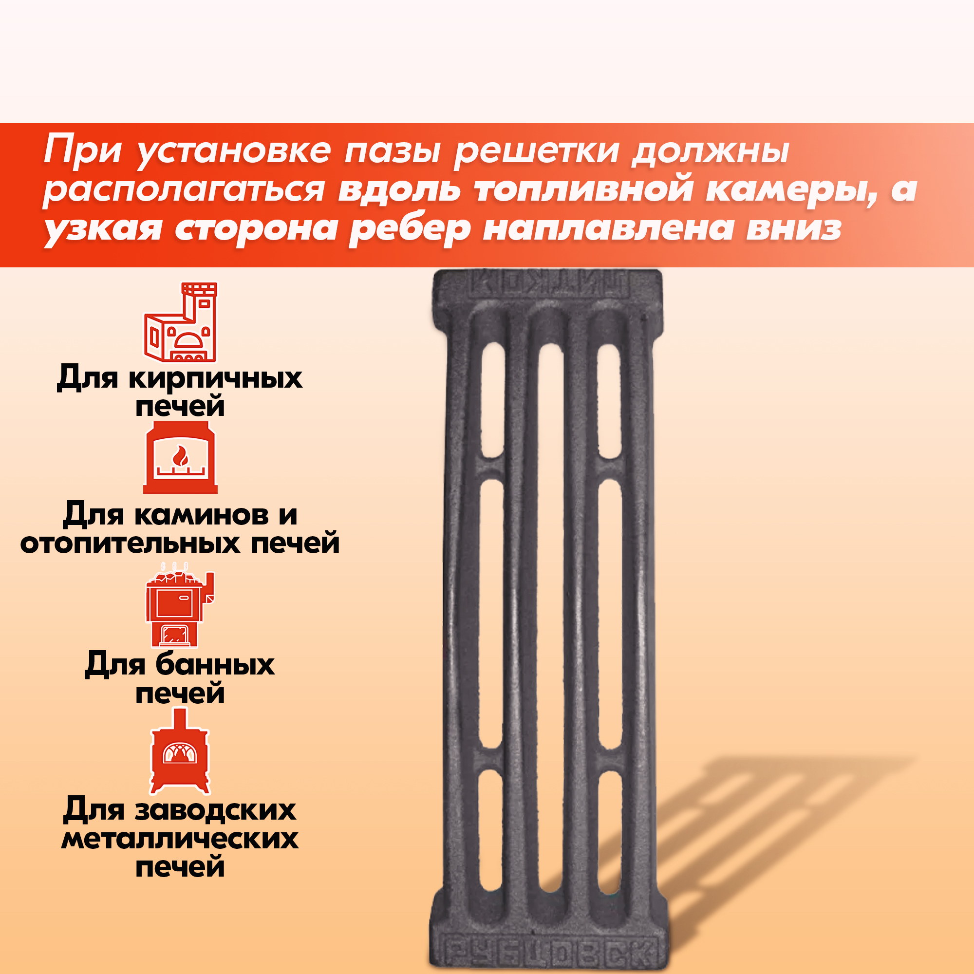 Располагать решетку колосниковую в топке обязательно узкой стороной ребер вниз, иначе срок её службы значительно снижается.