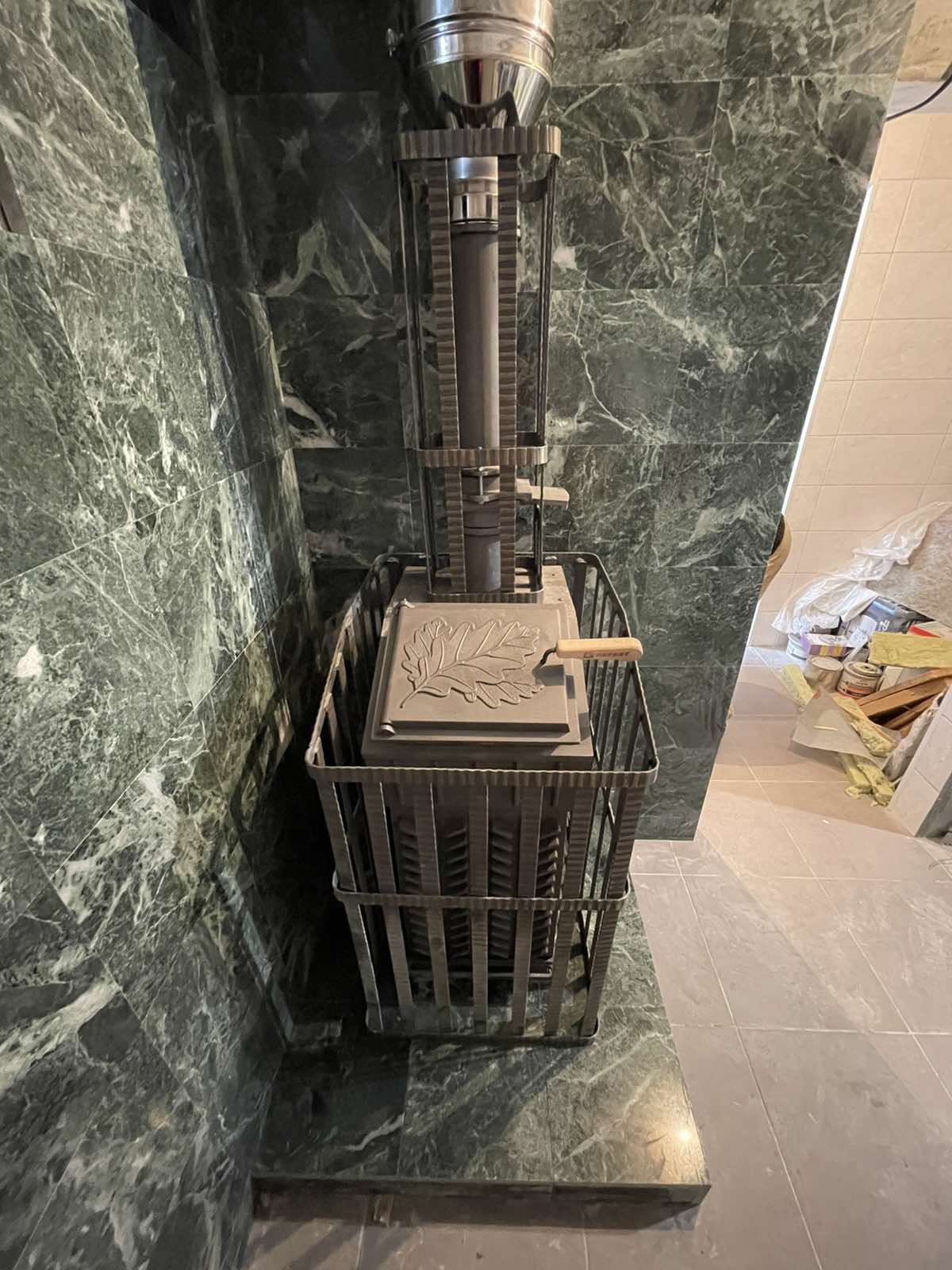 Обустройство парной с облицовкой змеевиком с установкой банной печи и дымохода