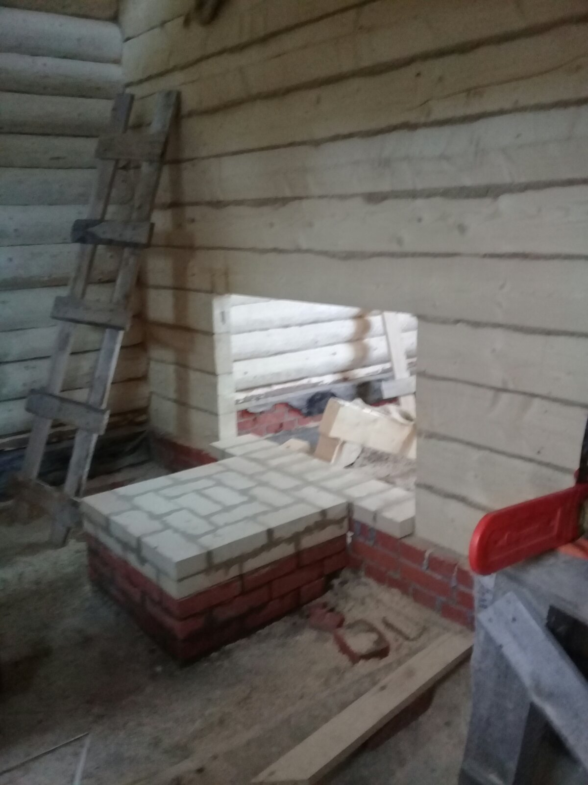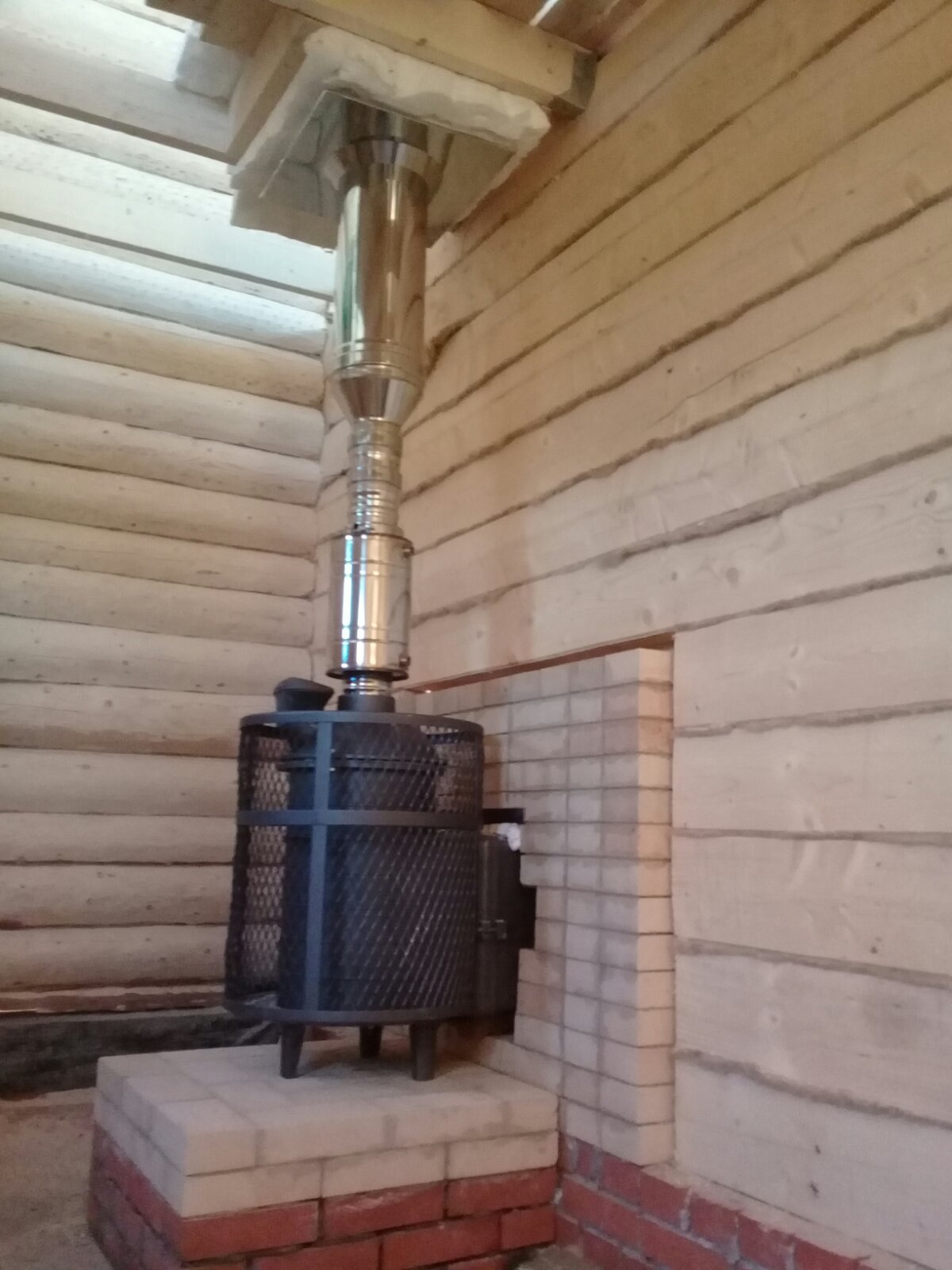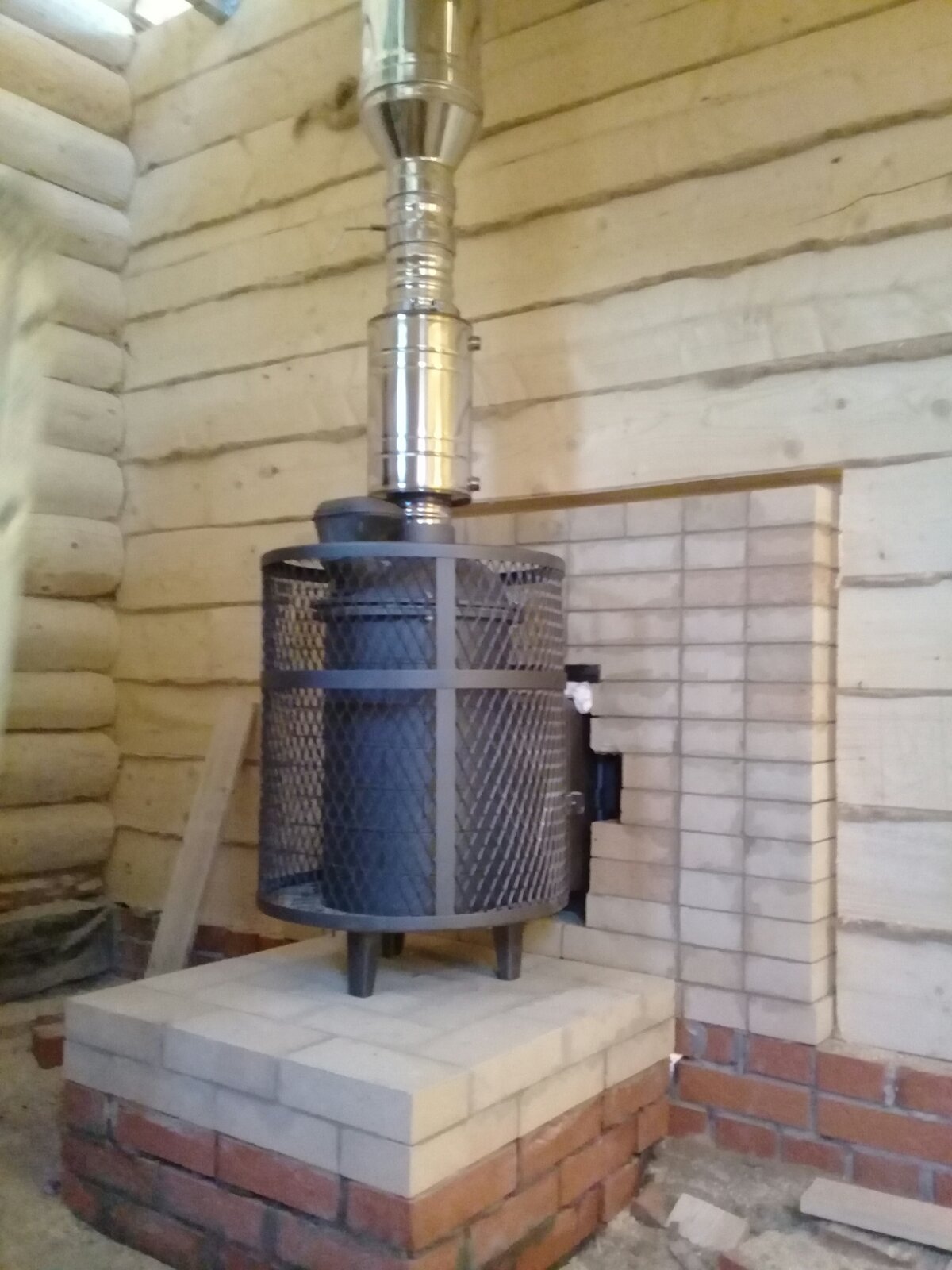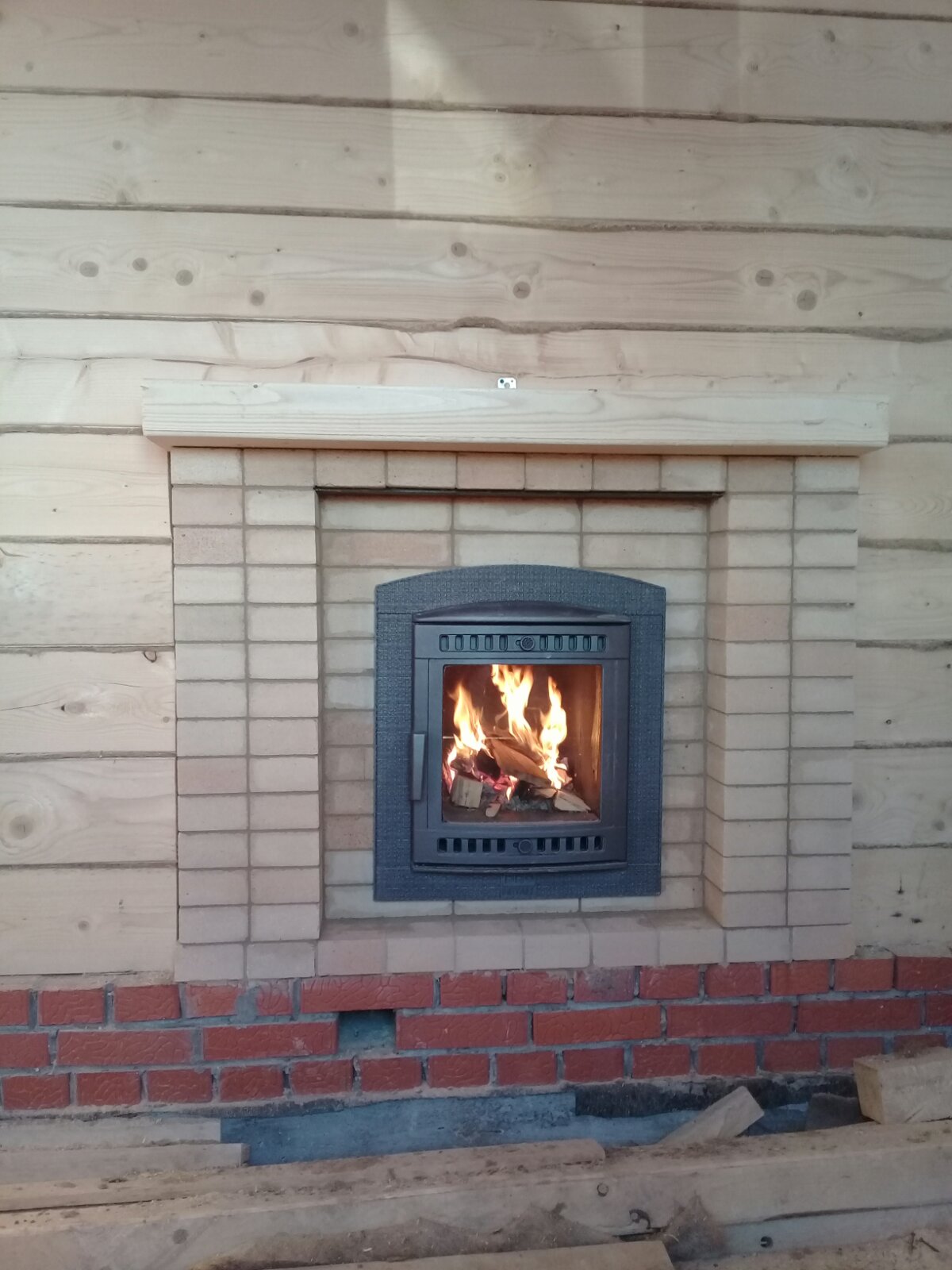 Монтаж печи Атмосфера с установкой коплекта дымохода и кирпичного портала.